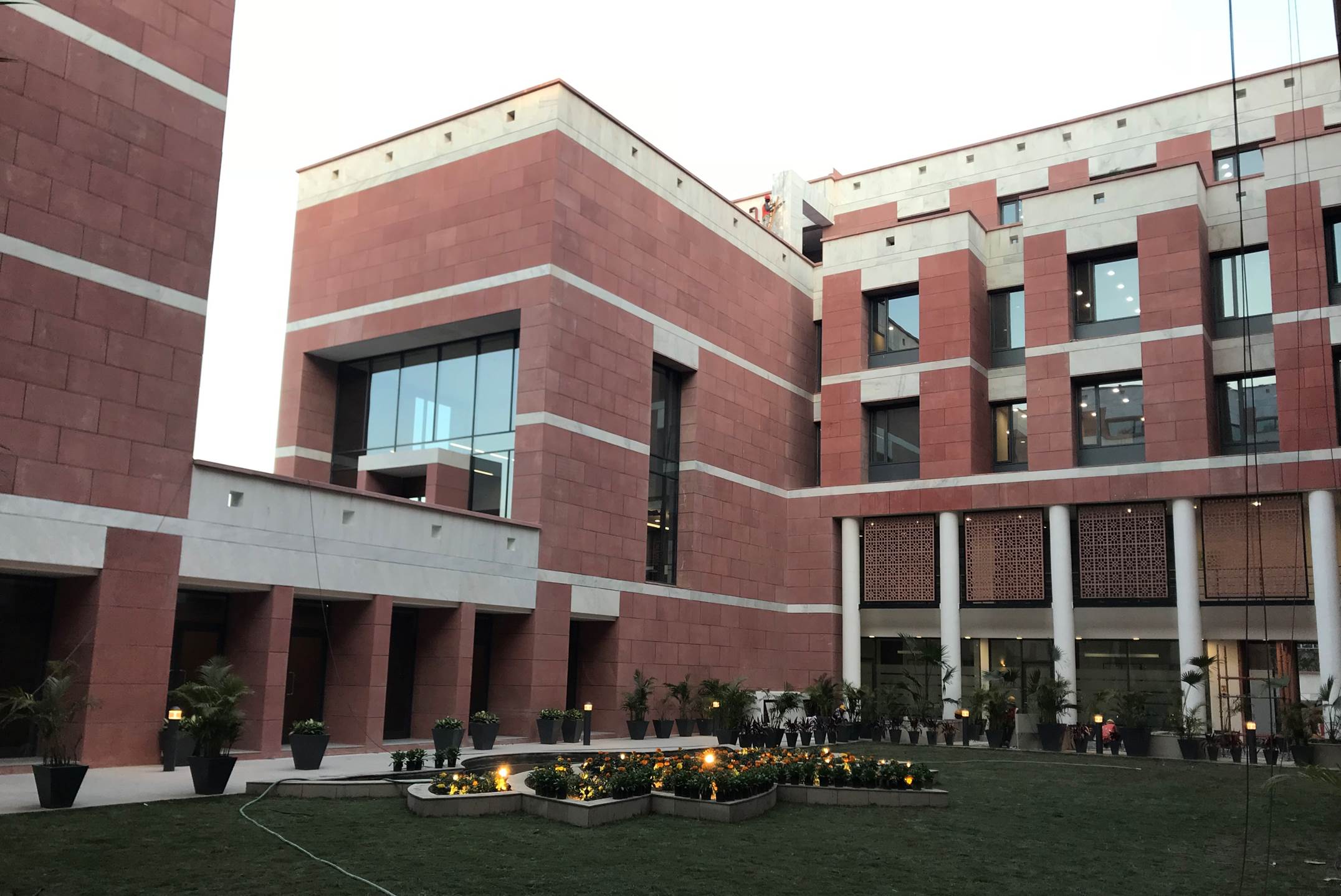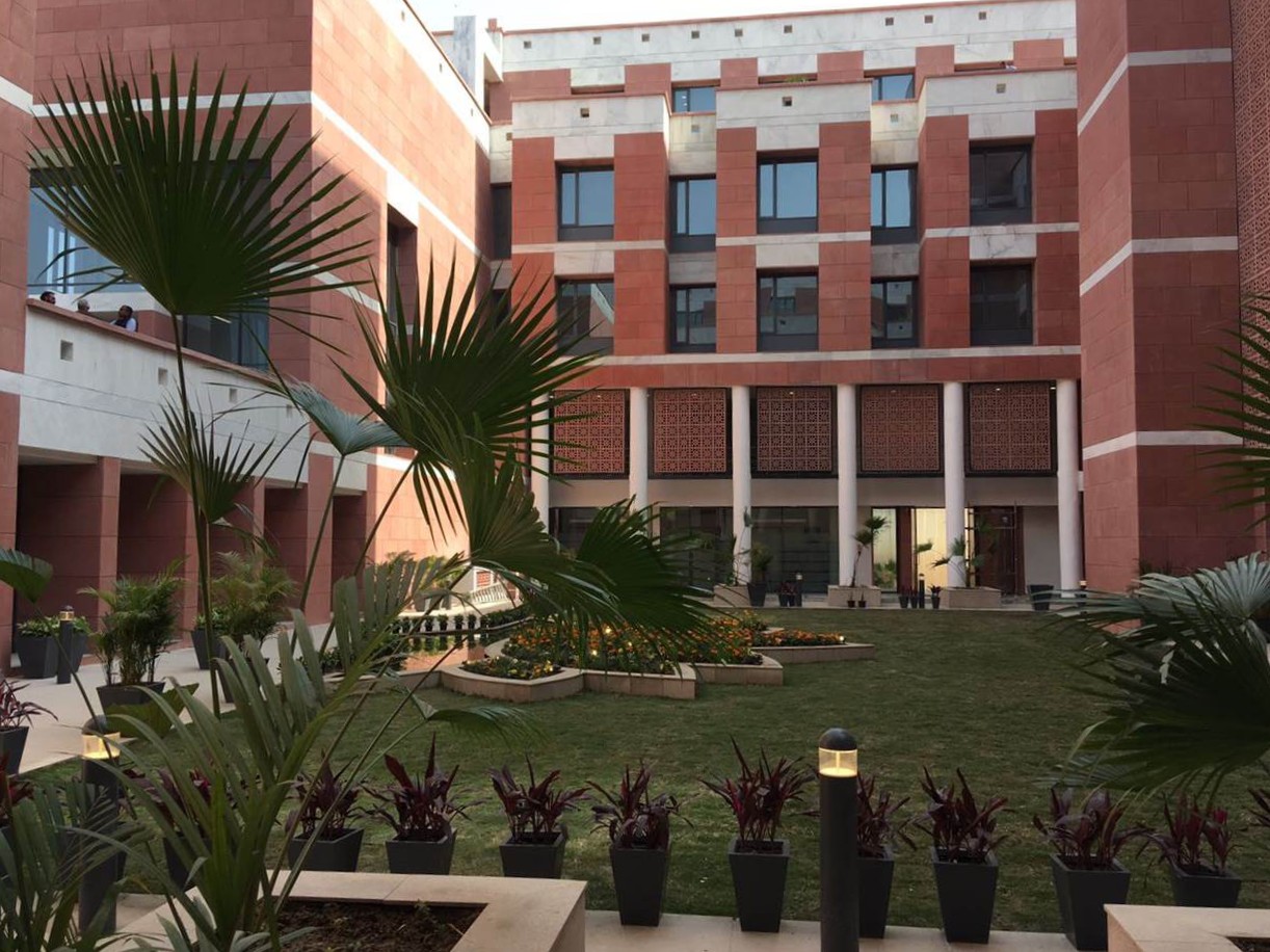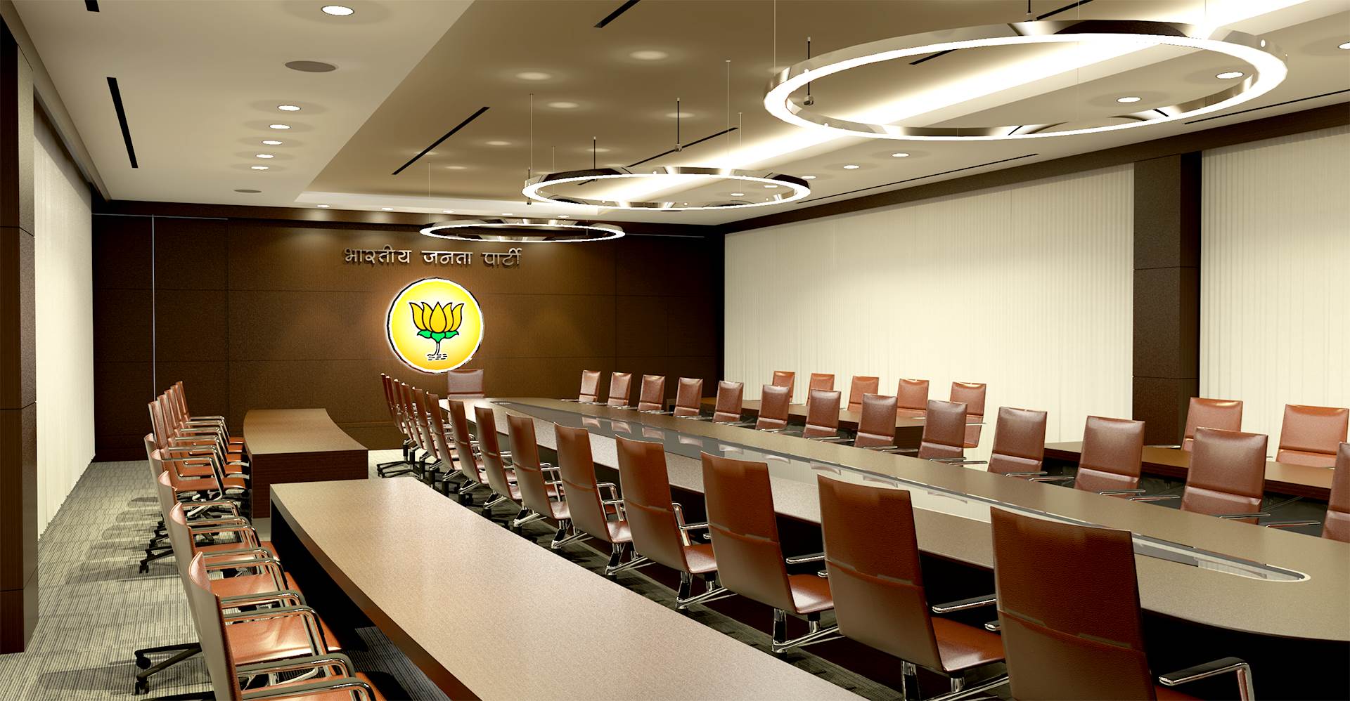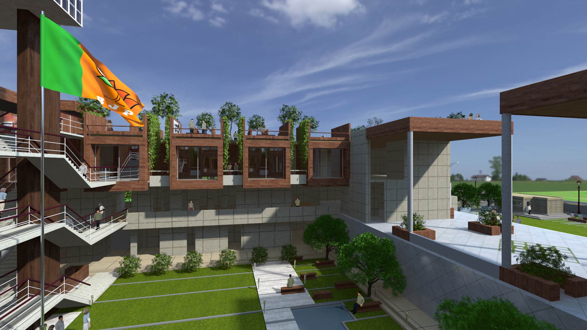 The BJP Headquarters in New Delhi is conceived as a formal institutional complex organized around a central landscaped courtyard that acts as the spatial and symbolic heart of the building. The architecture emphasizes clarity, symmetry, and hierarchy, expressed through stacked horizontal floor plates, exposed circulation bridges, and a strong axial alignment terminating at the central flag mast. Open galleries, stairways, and bridges promote visual connectivity and transparency across floors, reinforcing internal interaction and legibility. The courtyard lawn and structured pathways introduce landscape as an ordering device, softening the mass while supporting gathering and ceremonial functions. Overall, the project presents a contemporary civic architecture that balances openness with authority, aligning spatial organization, movement, and symbolism appropriate to the headquarters of Bharatiya Janata Party in New Delhi. The interior of the BJP Headquarters in New Delhi is designed to reflect a strong institutional identity through a contemporary and refined design language. The use of rich material finishes, structured surfaces, and a balanced colour palette creates a formal, dignified, and cohesive environment. The design integrates modern lighting, transparent partitions, and carefully selected interior elements to enhance spatial clarity and functionality. Natural elements such as indoor greenery and open, well-lit areas introduce a sense of openness and balance, contributing to a welcoming yet professional atmosphere. Overall, the interior establishes a composed and functional setting that reflects the stature, identity, and operational efficiency of the institution.