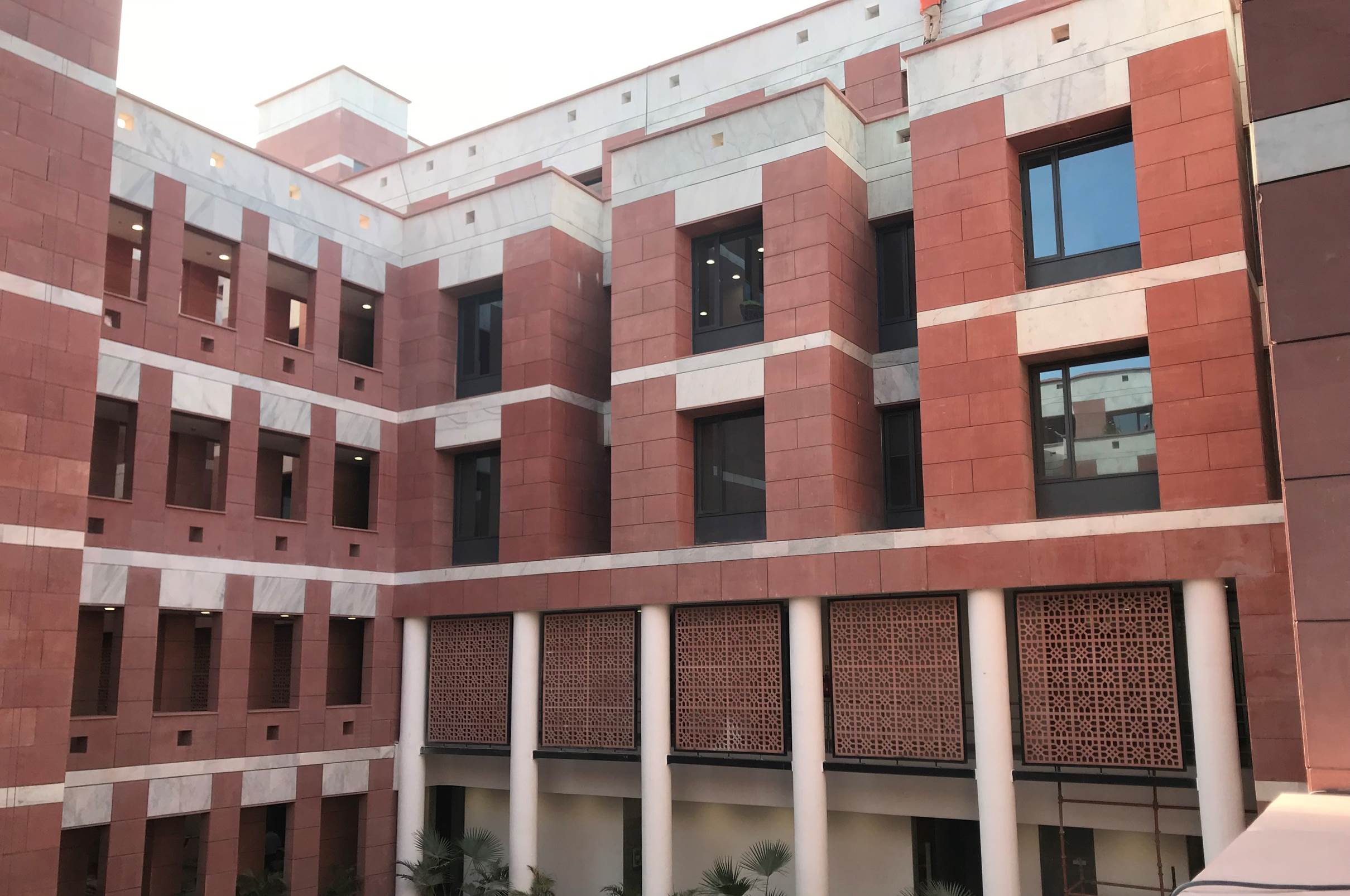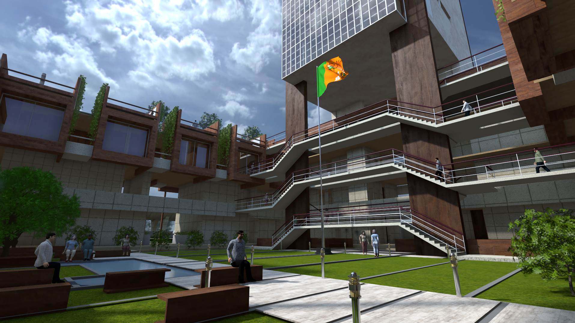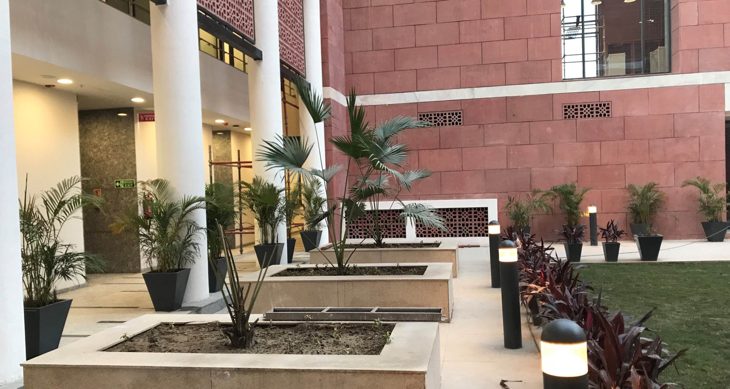 The BJP Headquarters in New Delhi is conceived as a formal institutional complex organized around a central landscaped courtyard that acts as the spatial and symbolic heart of the building. The architecture emphasizes clarity, symmetry, and hierarchy, expressed through stacked horizontal floor plates, exposed circulation bridges, and a strong axial alignment terminating at the central flag mast. Open galleries, stairways, and bridges promote visual connectivity and transparency across floors, reinforcing internal interaction and legibility. The courtyard lawn and structured pathways introduce landscape as an ordering device, softening the mass while supporting gathering and ceremonial functions. Overall, the project presents a contemporary civic architecture that balances openness with authority, aligning spatial organization, movement, and symbolism appropriate to the headquarters of Bharatiya Janata Party in New Delhi. The interior of the BJP Headquarters in New Delhi is designed to reflect a strong institutional identity through a contemporary and refined design language. The use of rich material finishes, structured surfaces, and a balanced colour palette creates a formal, dignified, and cohesive environment. The design integrates modern lighting, transparent partitions, and carefully selected interior elements to enhance spatial clarity and functionality. Natural elements such as indoor greenery and open, well-lit areas introduce a sense of openness and balance, contributing to a welcoming yet professional atmosphere. Overall, the interior establishes a composed and functional setting that reflects the stature, identity, and operational efficiency of the institution.