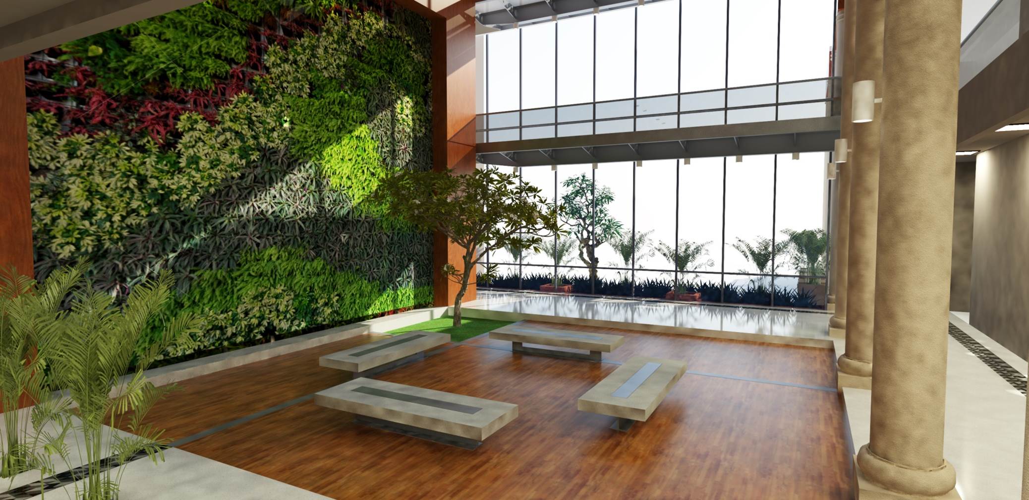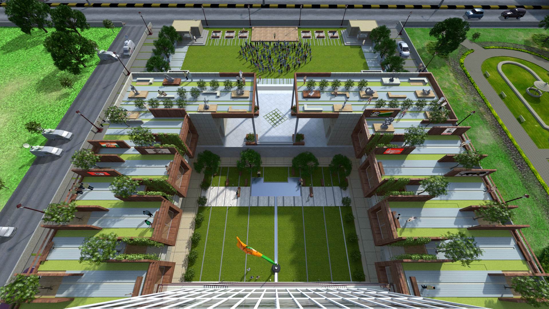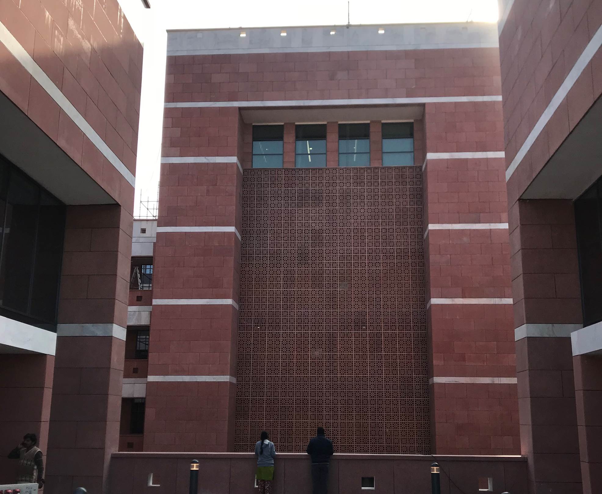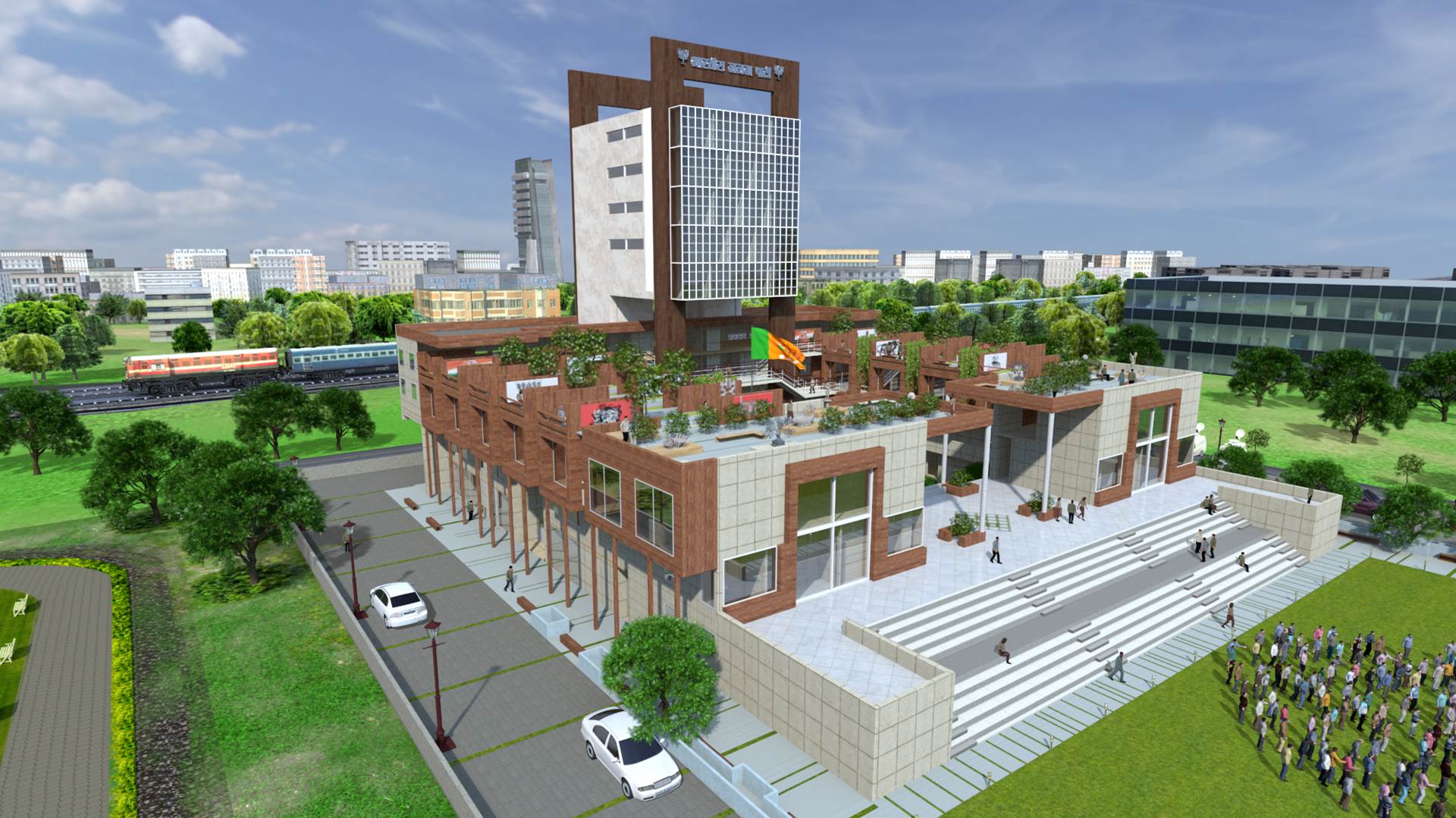 The BJP Headquarters in New Delhi is conceived as a formal institutional complex organized around a central landscaped courtyard that acts as the spatial and symbolic heart of the building. The architecture emphasizes clarity, symmetry, and hierarchy, expressed through stacked horizontal floor plates, exposed circulation bridges, and a strong axial alignment terminating at the central flag mast. Open galleries, stairways, and bridges promote visual connectivity and transparency across floors, reinforcing internal interaction and legibility. The courtyard lawn and structured pathways introduce landscape as an ordering device, softening the mass while supporting gathering and ceremonial functions. Overall, the project presents a contemporary civic architecture that balances openness with authority, aligning spatial organization, movement, and symbolism appropriate to the headquarters of Bharatiya Janata Party in New Delhi. The interior of the BJP Headquarters in New Delhi is designed to reflect a strong institutional identity through a contemporary and refined design language. The use of rich material finishes, structured surfaces, and a balanced colour palette creates a formal, dignified, and cohesive environment. The design integrates modern lighting, transparent partitions, and carefully selected interior elements to enhance spatial clarity and functionality. Natural elements such as indoor greenery and open, well-lit areas introduce a sense of openness and balance, contributing to a welcoming yet professional atmosphere. Overall, the interior establishes a composed and functional setting that reflects the stature, identity, and operational efficiency of the institution.