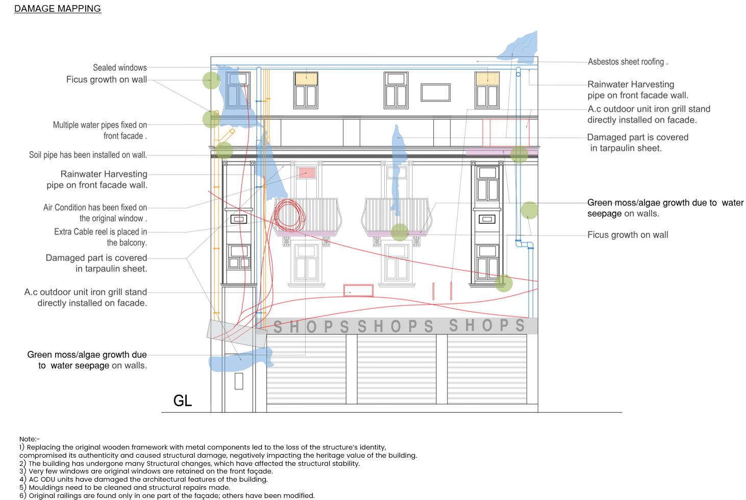 Noble Chambers is a conservation project focused on documenting, restoring, and preserving the building while retaining its existing functional use. The project involves detailed damage mapping to identify deterioration, alterations, and structural issues affecting the building’s architectural character. The conservation approach aims to restore original elements, improve structural stability, and reinstate the façade’s visual integrity while respecting its heritage significance. The project ensures the continuity of use while preserving the historic identity and extending the building’s lifespan.