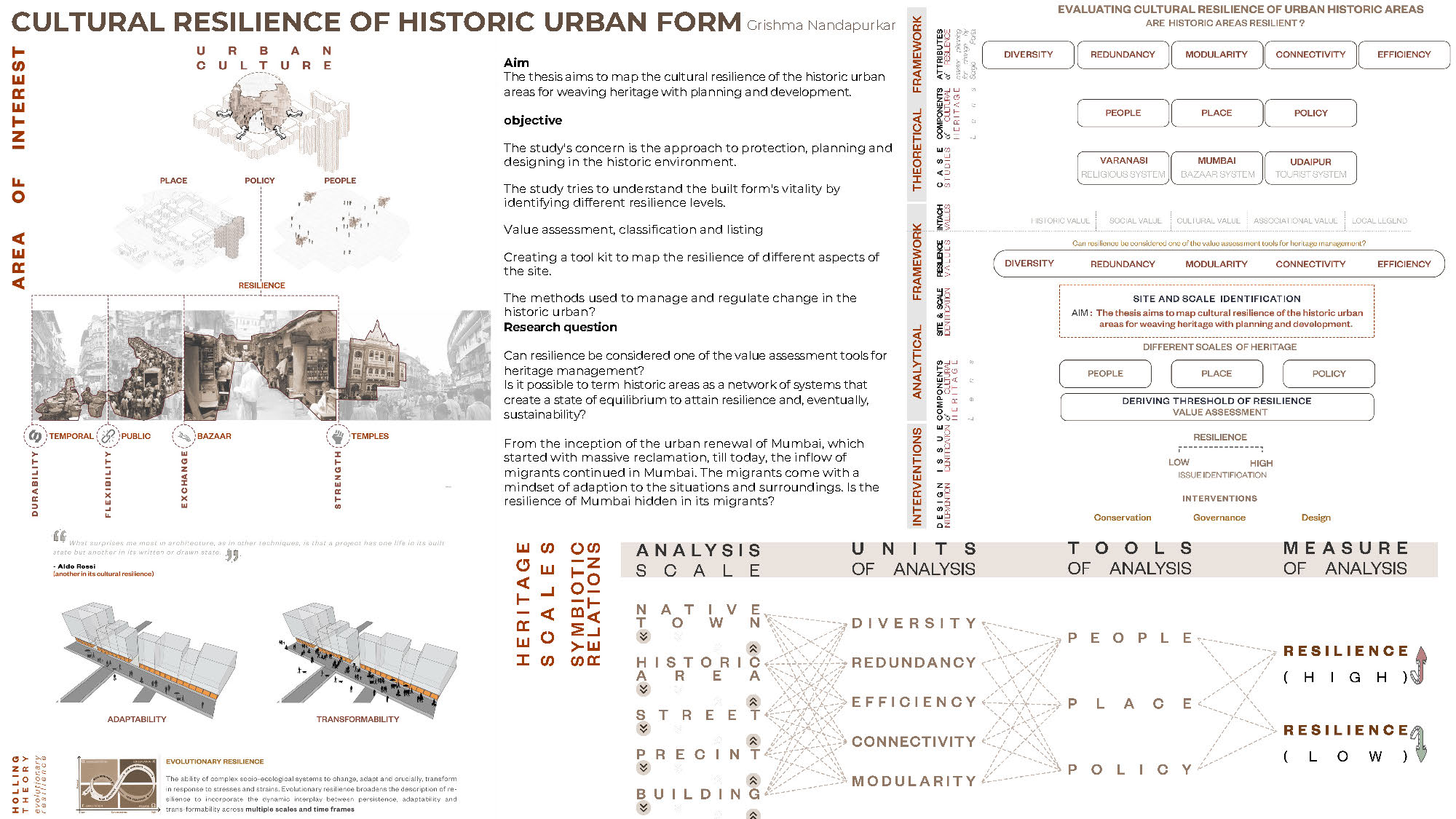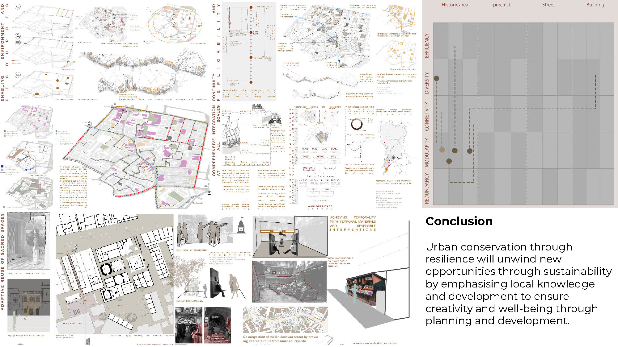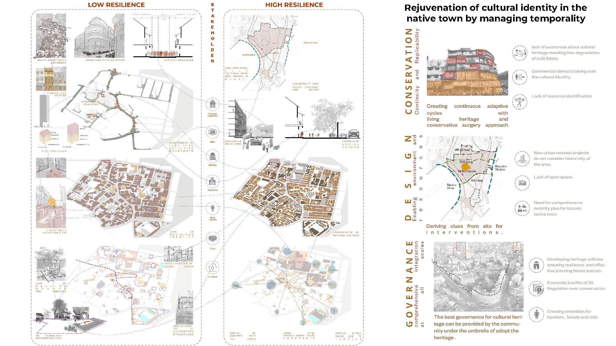 Historic Urban forms are dynamic systems shaped by the layers of social, cultural, and spatial evolution. In many cases, these forms remain unrecognised, not for lack of value, but because they derive their resilience from a symbiotic relationship with surrounding cultural practices and structures. This study contributes to the discourse on unacknowledged heritage by identifying such historic forms, whose persistence and relevance are enabled by cultural interdependencies that remain poorly acknowledged. Focusing on Mumbai’s Bhuleshwar area-a precinct known for its bustling market streets- the research reveals how these urban forms are intimately tied to a network of community-built temples. These temples, acting as cultural anchors, have enabled economic activity and civic life to flourish around them. The study argues for a participatory, people-centred approach to heritage, where cultural interconnections sustain livelihoods and generate resilience. Here, resilience is understood as a proactive and preventive strategy, anticipating pressures before they result in irreversible loss. The proposed Zonal Cultural Framework categorises areas into high and low resilience zones, utilising typological mapping, archival research, and community engagement to assess adaptive capacities. This interdisciplinary model supports conservation strategies integrating development with unrecognised yet resilient cultural forms.