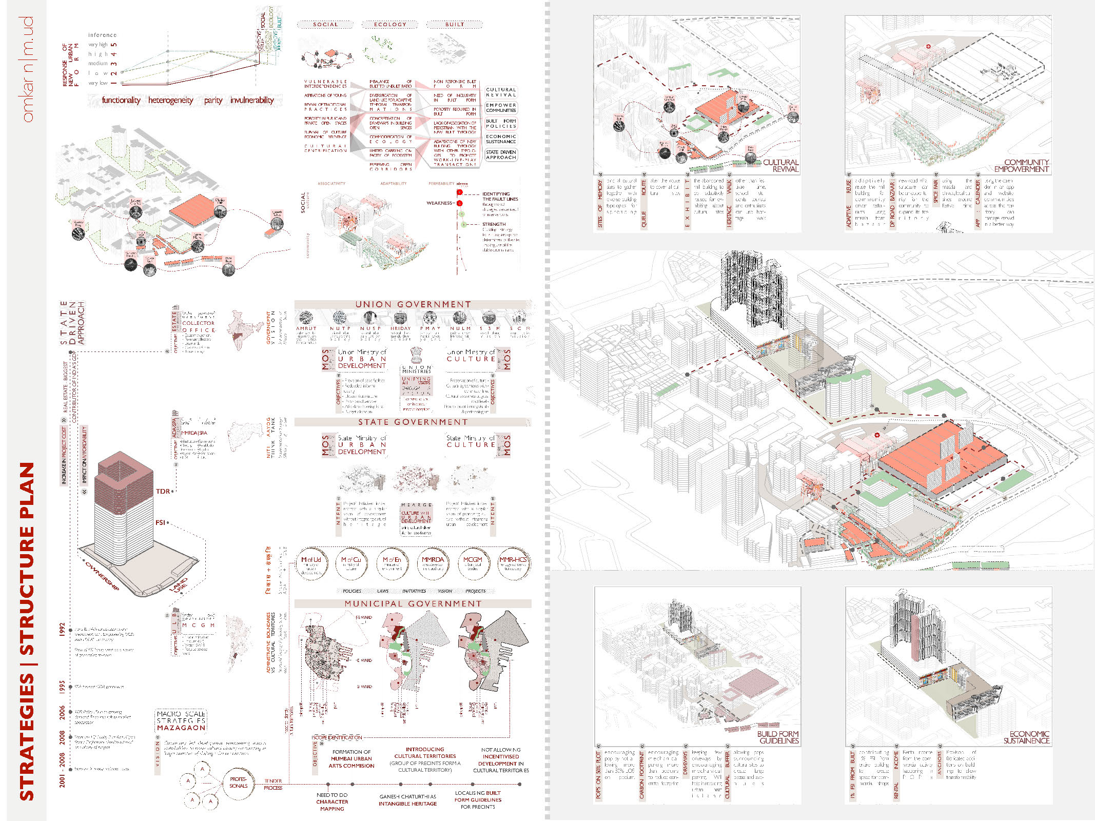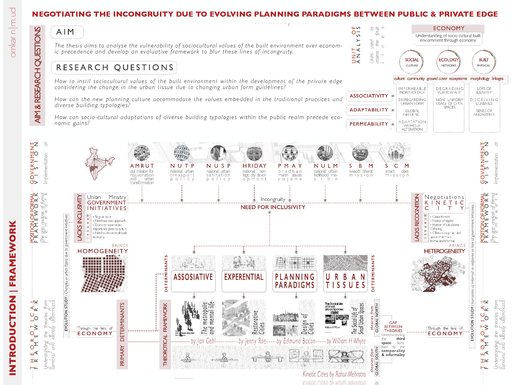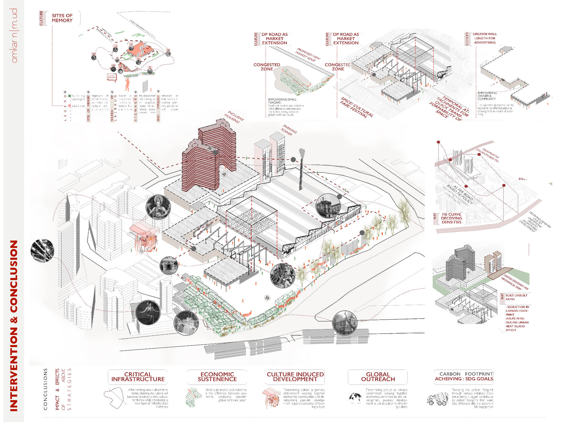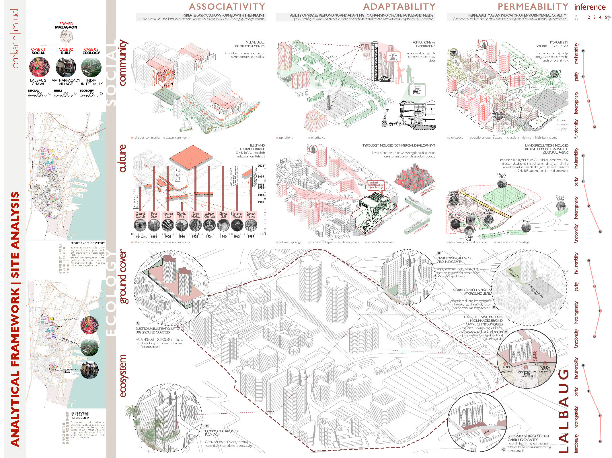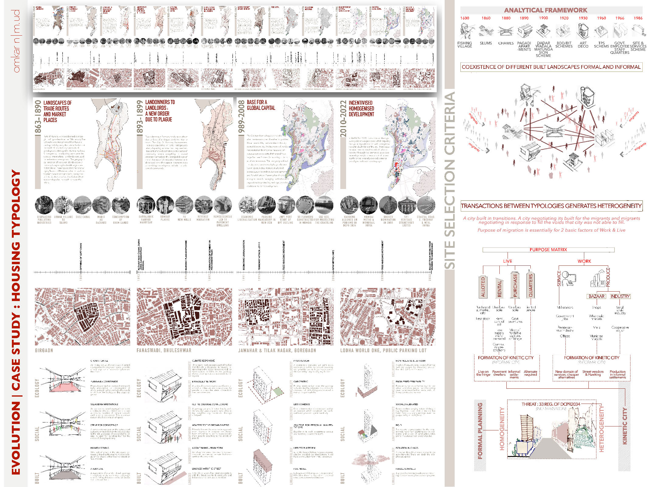 Cities across the globe have undergone periodic transformation in their planning paradigms based on geo political events, economic policies and vision plans. Mumbai has traversed this path of mutations in planning paradigms shaped by global influence of evolving architectural, social and political landscapes during pre and post colonial period. The original inhabitants witnessed the metamorphosis in order to accommodate the needs of growing influx of migrants. In order to satisfy the needs of improving housing infrastructure, various formal initiatives were undertaken by the state which couldn’t satiate the demand of housing. Due to this, informal settlements, industries and bazaars transgressed in the residual spaces in the city. The negotiations formed by the informal economy germinated over the evolving landscapes of the city. The heterogeneity manifested through coexistence of these diverse formal and informal building typologies emit a sense of harmony and cultural diversity. Before liberalisation, The binaries of the city were recognised as complex spatial organism and was viewed as a vital cog in a larger framework which could not be easily reproduced through formal planning. On the contrary, Regulation No. 33 introduced in 1991 DCR seeks to flatten the complex systems in the informal networks by homogenising it with the formal fabric of the city. The myopic understanding of post liberalised planning framework led to formation of fault lines propagating a sense of Incongruity by disregarding the heterogeneity. To bring inclusivity in the planning framework, there is a need to derive a negotiating framework through understanding incongruity by recognising the existence of complex spatial informal networks that have evolved over time. This thesis aims to analyse the social, ecological and built lines of incongruity through micro urbanism. As economy is the main protagonist in bringing about speculated development, the inferences derived from the micro urbanism would be contemplated through economy to propose site specific recommendations in form of a framework which can be implemented in other parts of the city.