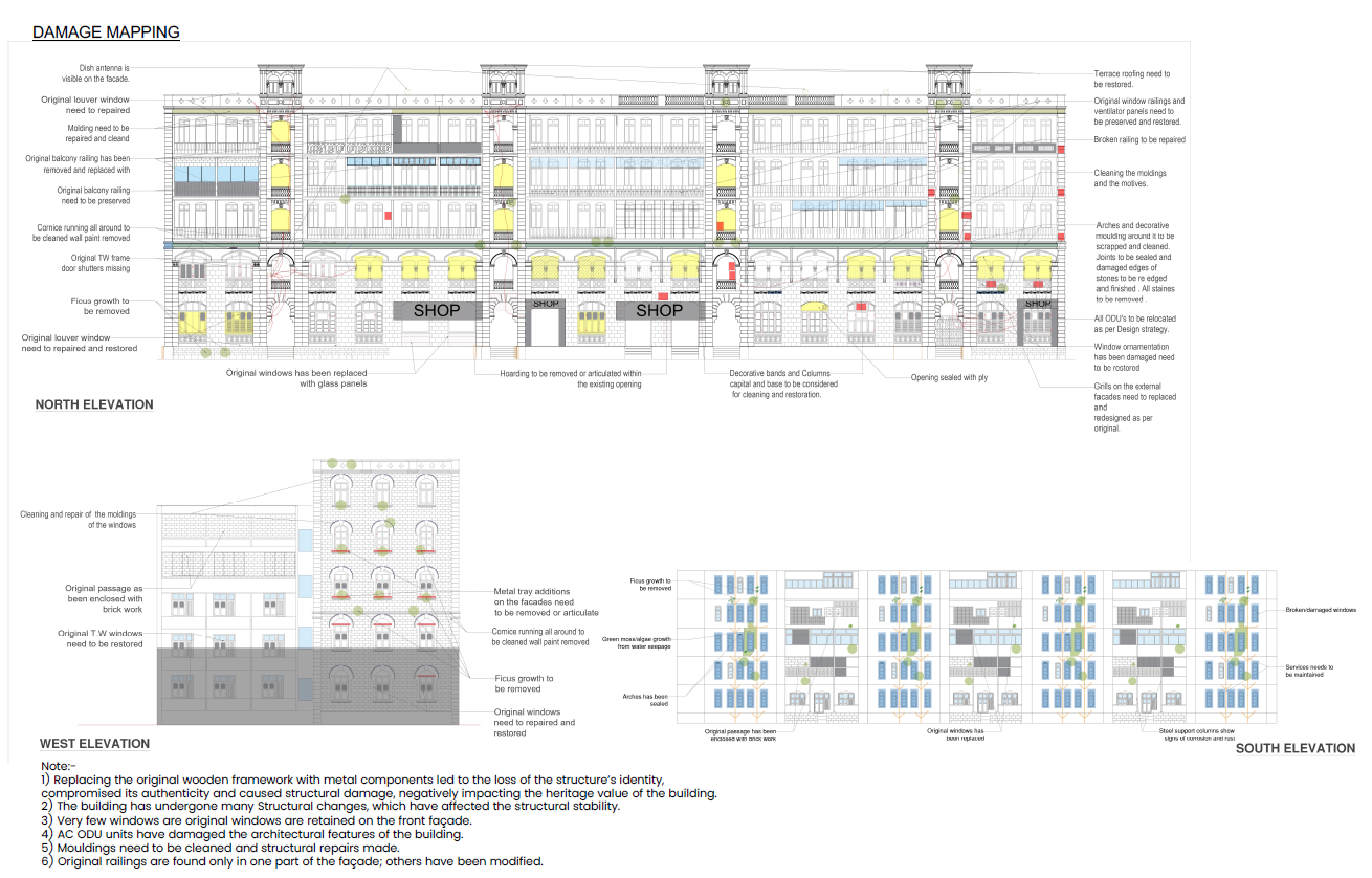 Sitaram Sadan is a heritage conservation project focused on the documentation, restoration, and preservation of a historic stone masonry building characterized by arched openings, decorative moldings, cornices, and traditional window elements. The damage mapping highlights deterioration, material alterations, and loss of original architectural features affecting the façade and structural integrity. The project aims to conserve the building’s architectural character and heritage value while ensuring its continued functional use and contribution to the historic precinct.