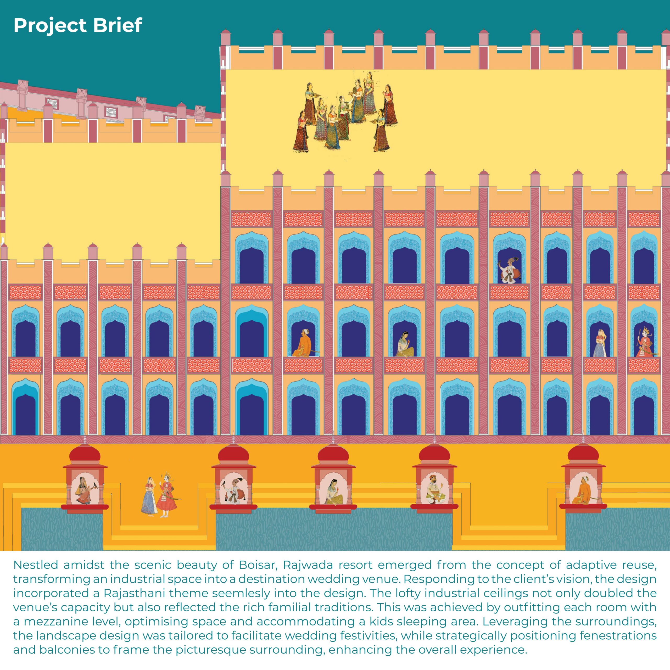 Nestled amidst the scenic beauty of Boisar, Rajwada resort emerged from the concept of adaptive reuse, transforming an industrial space into a destination wedding venue. Responding to the client’s vision, the design incorporated a Rajasthani theme seamlessly into the design. The lofty industrial ceilings not only doubled the venue’s capacity but also reflected the rich familial traditions. This was achieved by outfitting each room with a mezzanine level, optimising space and accommodating a kids sleeping area. Leveraging the surroundings, the landscape design was tailored to facilitate wedding festivities, while strategically positioning fenestrations and balconies to frame the picturesque surrounding, enhancing the overall experience.