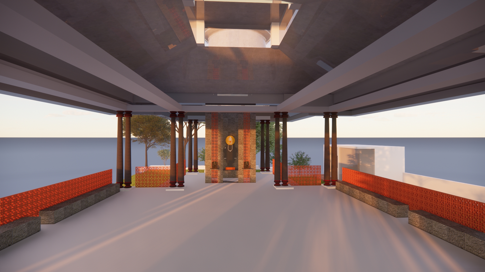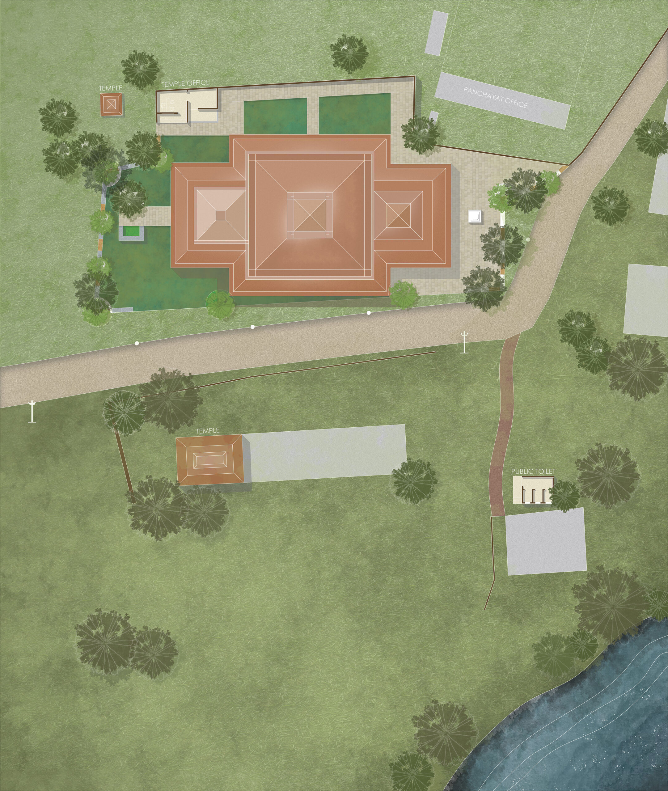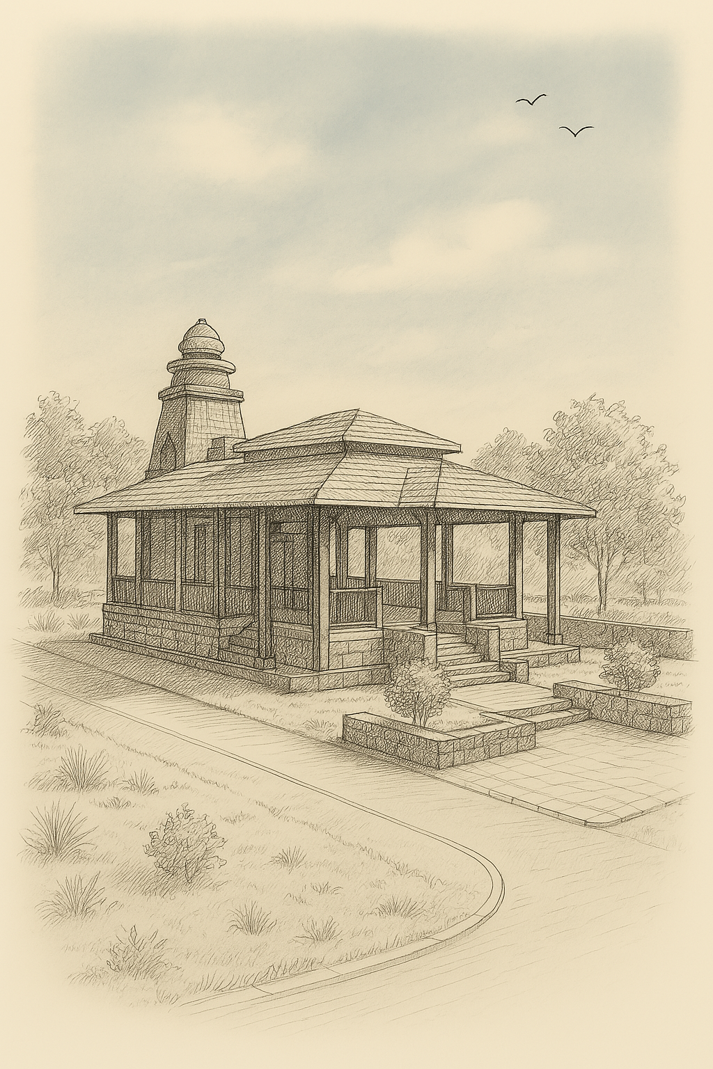The Vithal Mandir in the Konkan region is a compact, vernacular temple that responds directly to climate, context, and ritual. Raised on a plinth, the temple establishes a clear sacred presence, with a central shikhara marking the garbha griha. Terracotta-tiled sloping roofs with deep overhangs address monsoon conditions, while open pillared mandapas provide shaded, naturally ventilated transition spaces. The use of brick, stone, and timber-toned elements reflects regional construction traditions. Set within a simple landscaped setting of pathways and native trees, the temple integrates architecture, movement, and landscape in a calm and grounded manner.